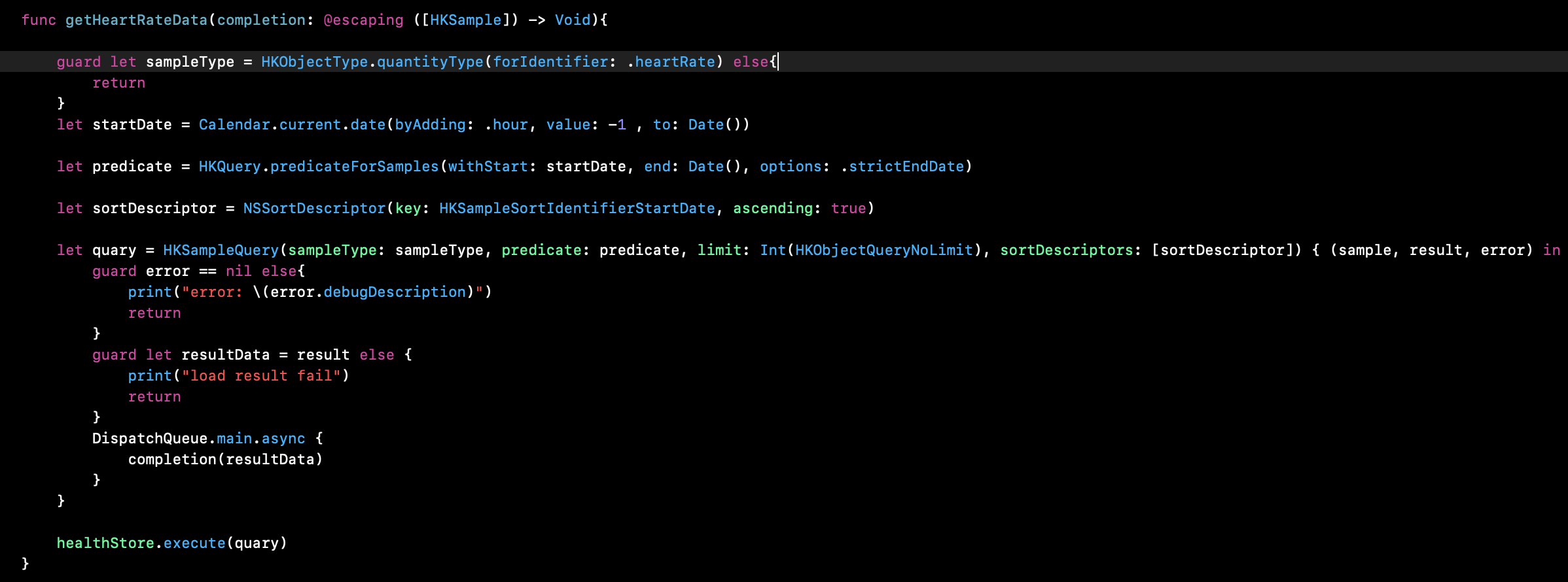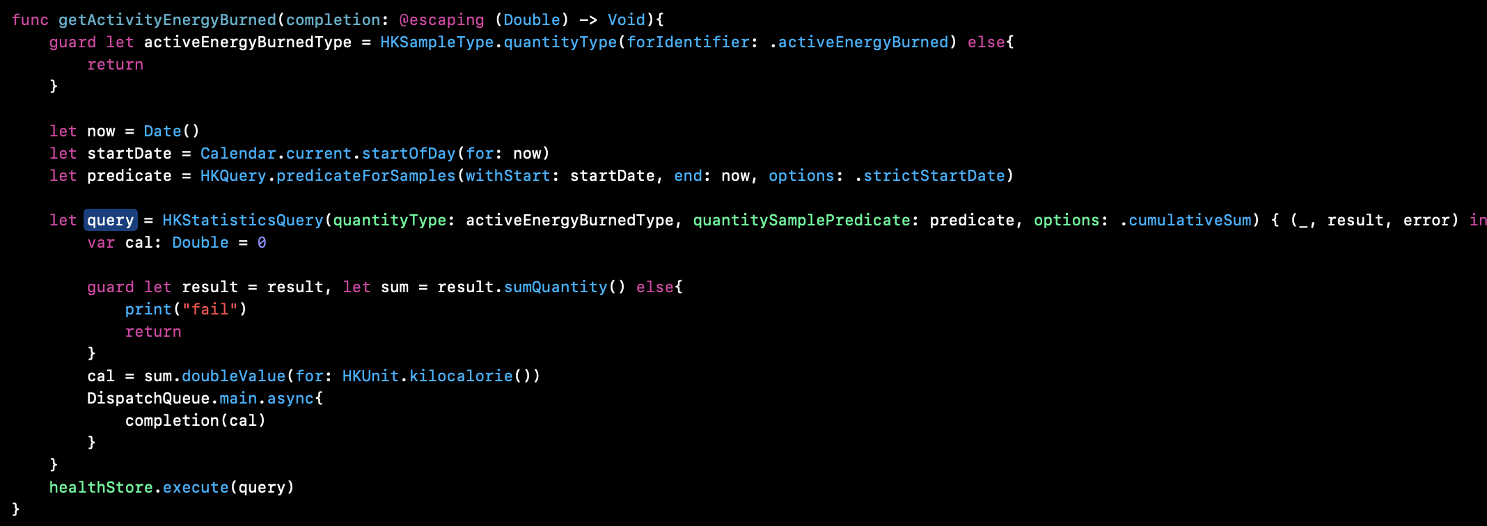 권한 다음은 위에서 말한 4개의 데이터 걸음수(stepCount), 걷거나 뛴 거리(distanceWalkingRunning), 심장 박동수 (heartRate), 소모한 칼로리(activityEnergyBurned)를 가져오는 로직입니다.