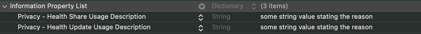 HealthKit 추가 2. info.plist에 property list에 추가해줍니다.