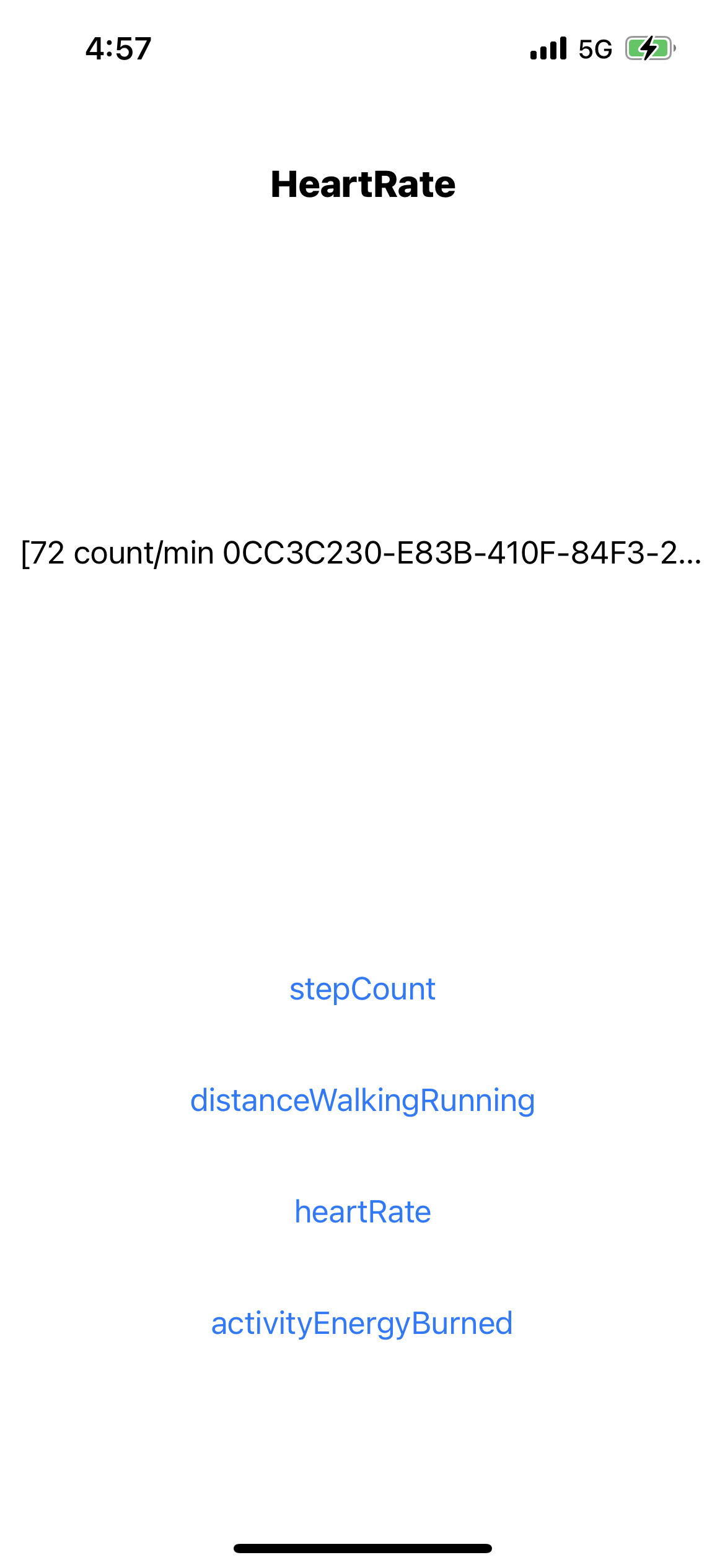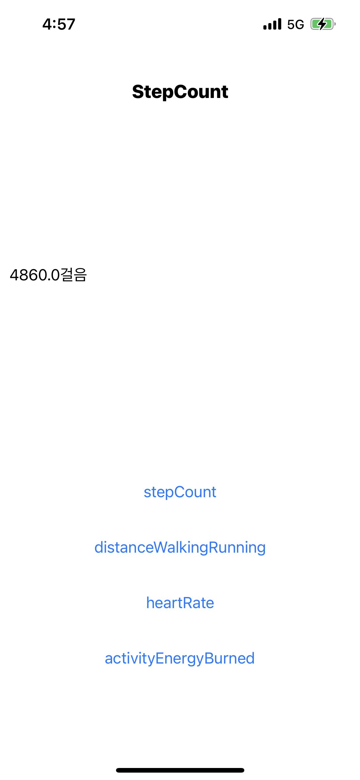샘플앱 사용할 건강 데이터는 걸음수(stepCount), 걷거나 뛴 거리(distanceWalkingRunning), 심장 박동수 (heartRate), 소모한 칼로리(activityEnergyBurned) 입니다.