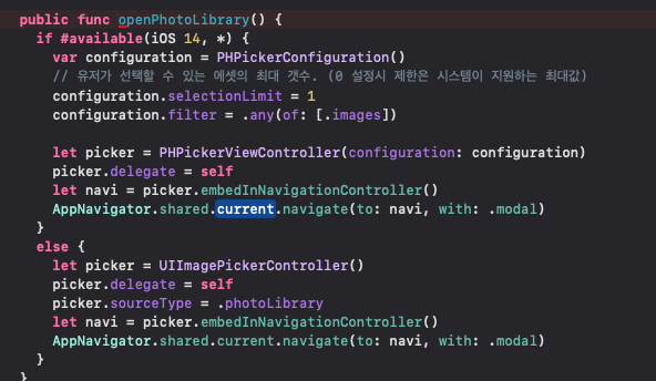 함수 구현 우선 14이상 부터 사용 가능해서 버전 별로 if 문으로 나눠 주고 14밑으로는 UIImagePickerController를 사용하게 해줬습니다.