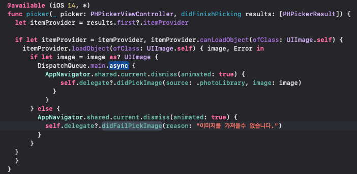 함수 구현 우선 14이상 부터 사용 가능해서 버전 별로 if 문으로 나눠 주고 14밑으로는 UIImagePickerController를 사용하게 해줬습니다.