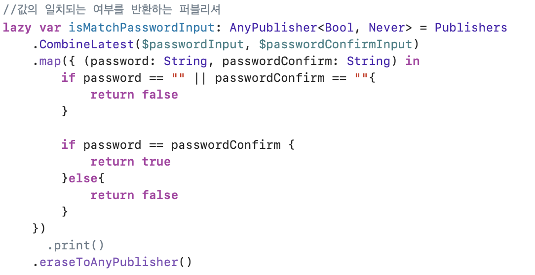위 퍼블리셔는 할당 받은 두 값 passwordInput, passwordConfirmInput을 비교해 같으면 true 아니면 flase를 return해주는 로직입니다.