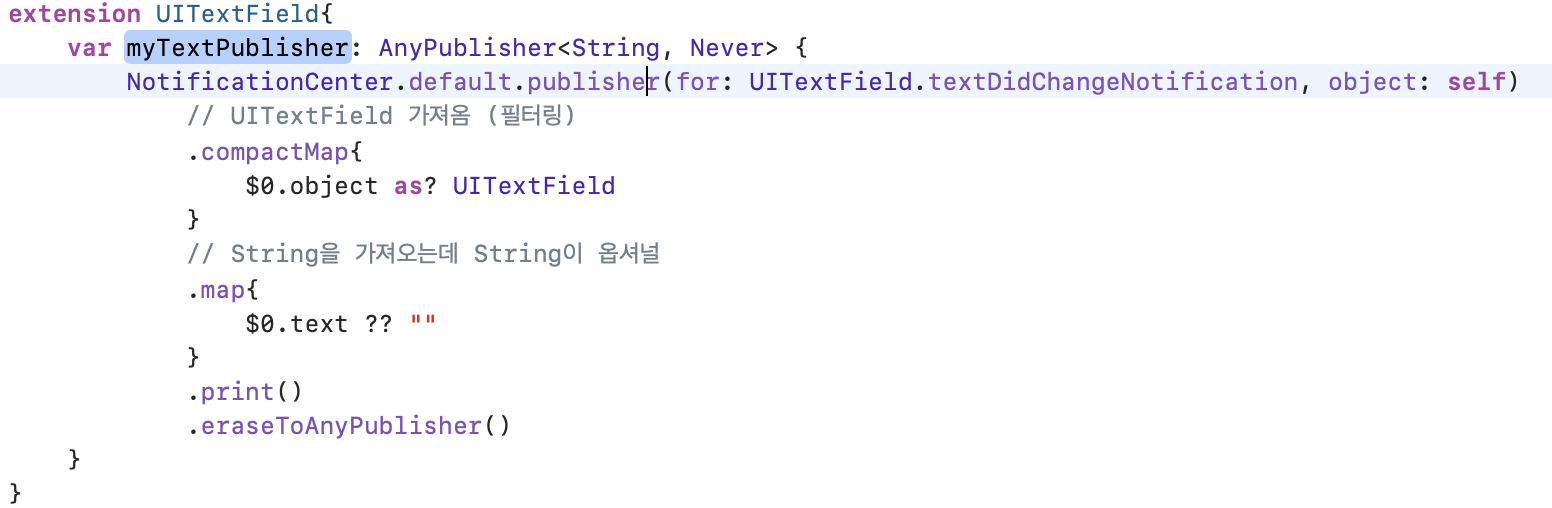 위처럼 Publisher를 만들어 준다. 타입은 AnyPublisher고 받아올 데이터는 String형이고 에러타입은 Never로 아무동작을 지정하지 않을거기 때문에 <String, Never>이런식으로 typelias를 지정해 준다. NotificationCenter에서는 기본적으로 Publisher를 제공해주는데 for안에는 텍스트 버튼을 눌러서 올라갈때,눌려있을때, 변경되었을때와 같은 ios제공해주는 동작을 넣어주면 됩니다. 이제 다음 compactMap과 map으로 필터링을 해주고 print()를 통해서 데이터를 로그로 확인합니다. eraseToAnyPublisher를 통해서 최종적인 publisher형태로 리턴해 줍니다. eraseToAnyPublisher는 지금까지 데이터 형태가 어떠했건간에 최종적인 publisher형태로 리턴합니다.