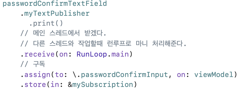 텍스트 필드 Outlet에 아까 extension에서 만들어줬던 myTextPublisher의 구독을 만들어 줍니다.