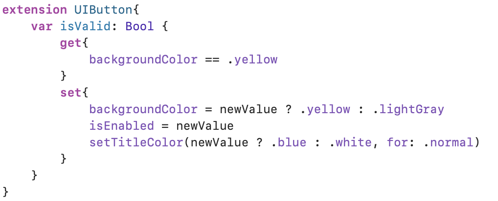 위 코드도 assign을 사용해서 버튼의 Extension에 있는 isValid에 값을 할당해주고 그 값의 get, set을 통해서