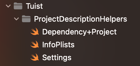 우선 보면 Tuist 폴더 아래에 ProjectDescriptionHelpers폴더를 만들고 아래에 Dependency+Project.swift, InfoPlists.swift, Settings.swift 파일을 만들어 줍니다. 그리고 Dependency+Project를 아래와 같이 작성합니다.