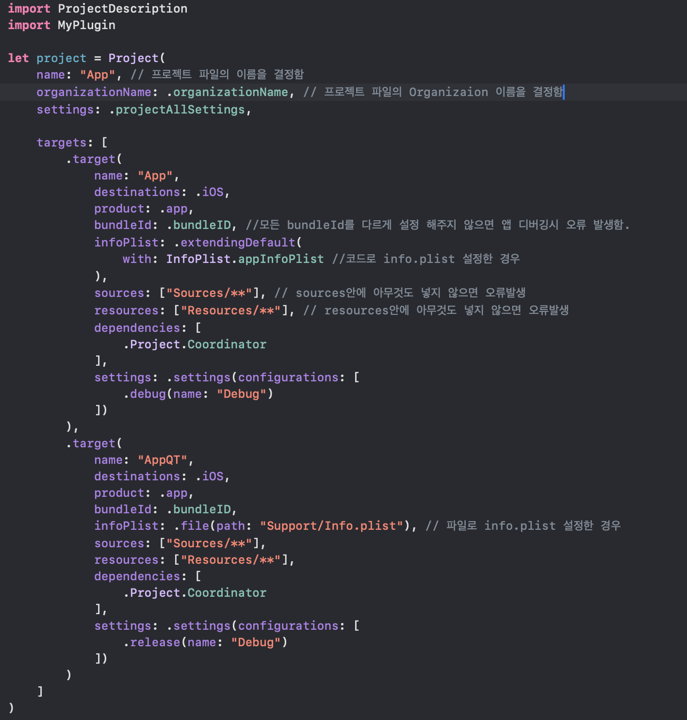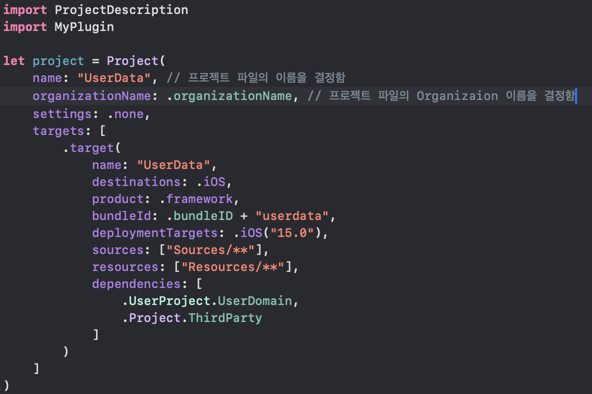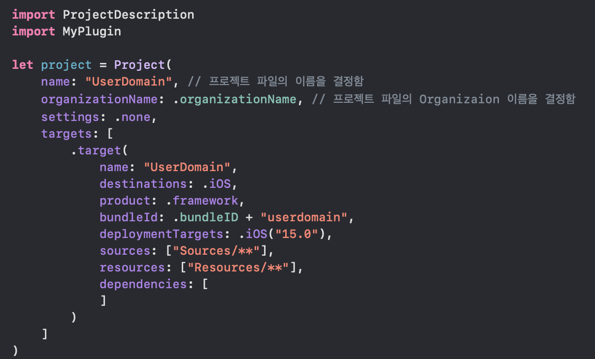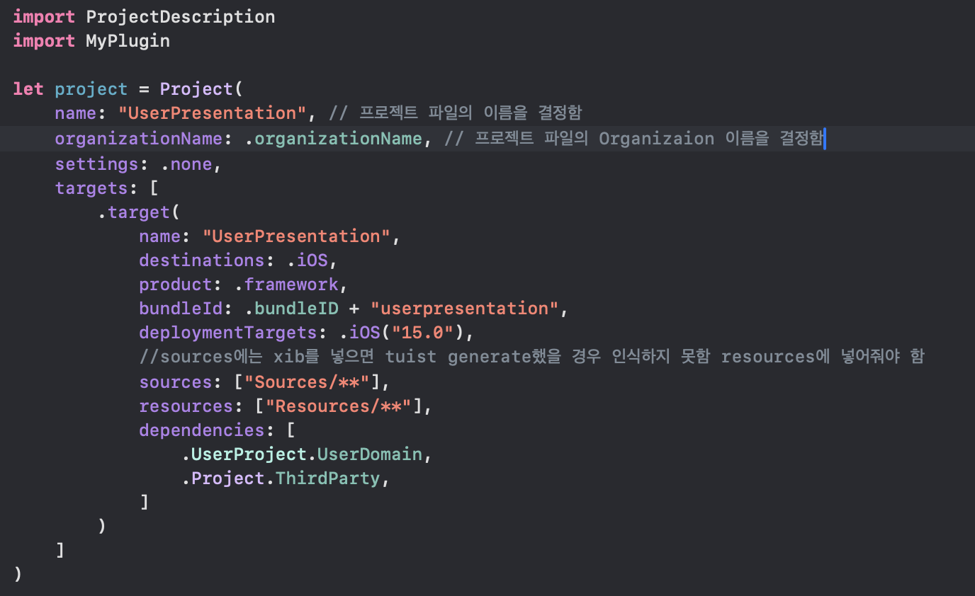 import ProjectDescription // Tuist project 내부에서 전역으로 사용할 기능 정리 let myPlugin = Plugin(name: "MyPlugin")위는 Plugin.swift 코드 입니다.