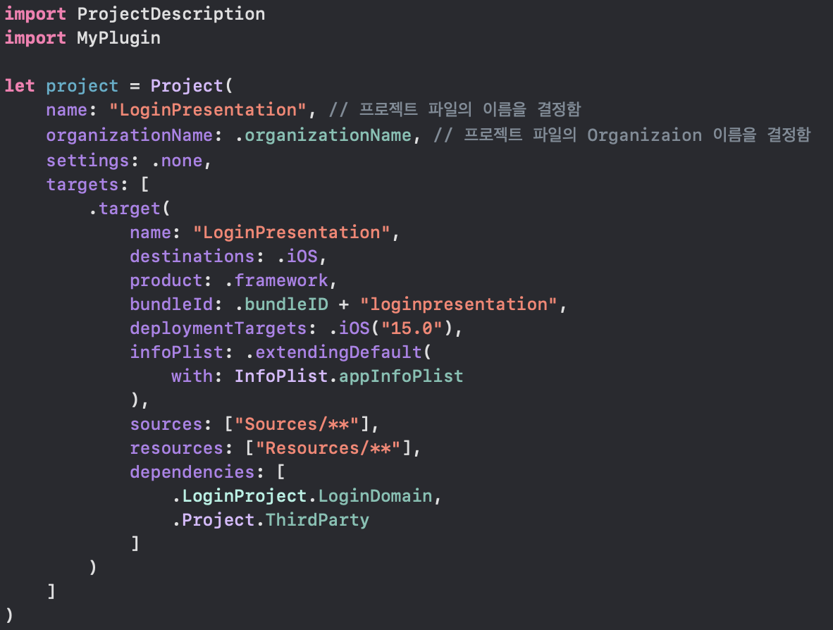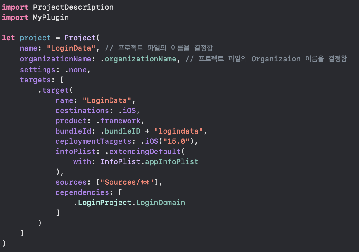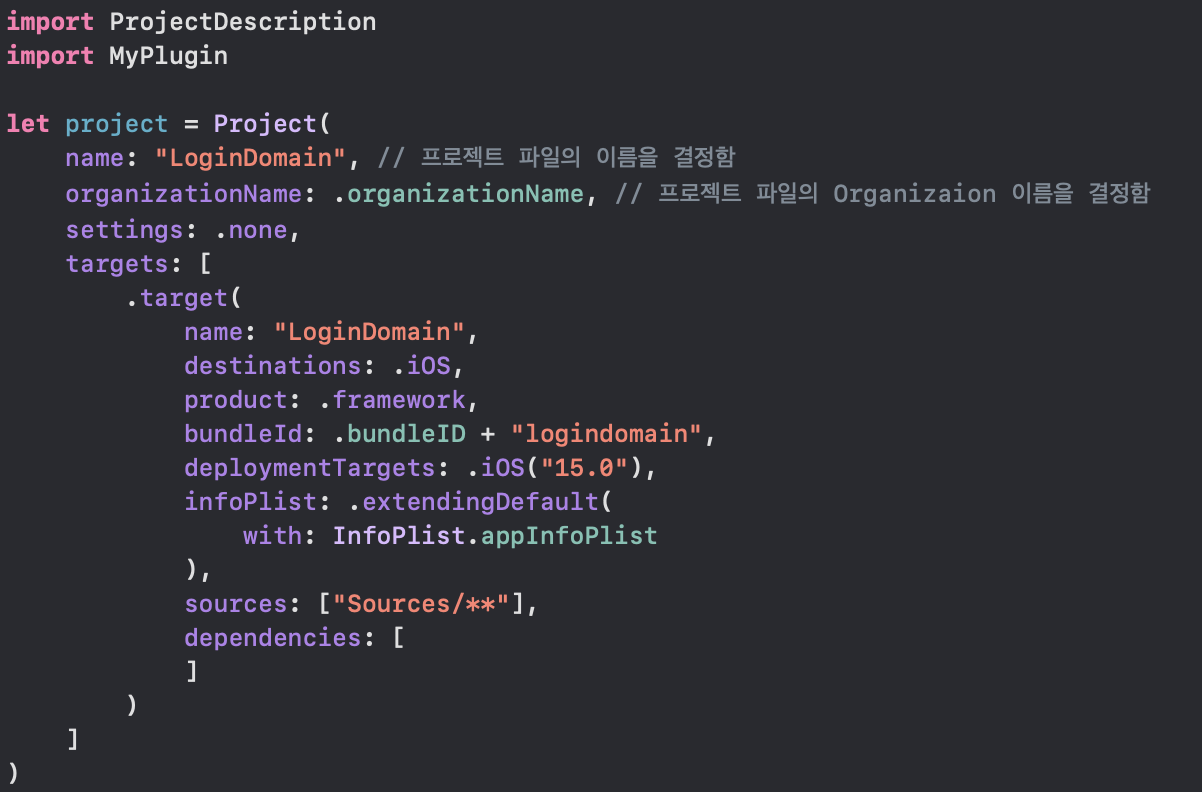 Settings.swift 위처럼 전역으로 써줄 settings, infoplist, dependency등을 설정해주고 이제 의존성이 없는 도메인 두개 UserDomain, LoginDomain을 작성하겠습니다.