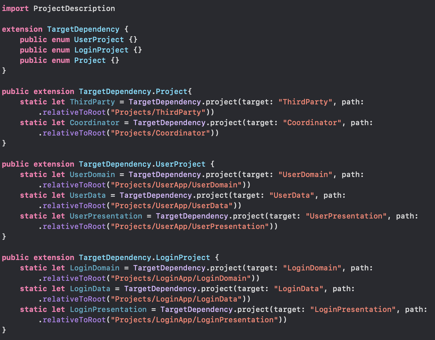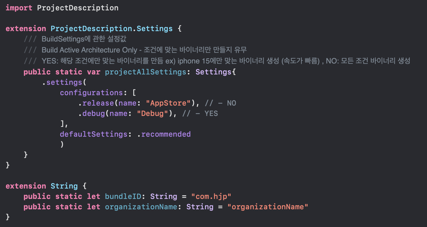그리고 같은 경로에 ProjectDescriptionHelpers 폴더 안에 swift파일 코드는 아래와 같습니다.