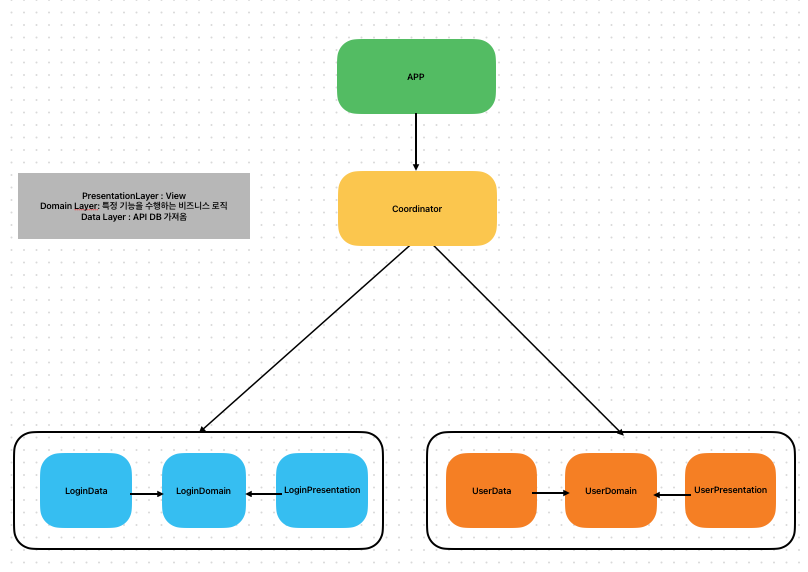 Clean Architecture에서는 Domain Layer는 Data Layer와 Presentation Layer만 보고 있어야 하고 Domain은 어떠한 의존성도 가지고 있으면 안됩니다. 또한 의존성 주입을 위해서 외부 즉 Coordinator에서 그 의존성을 가져야 한다고 생각했습니다.