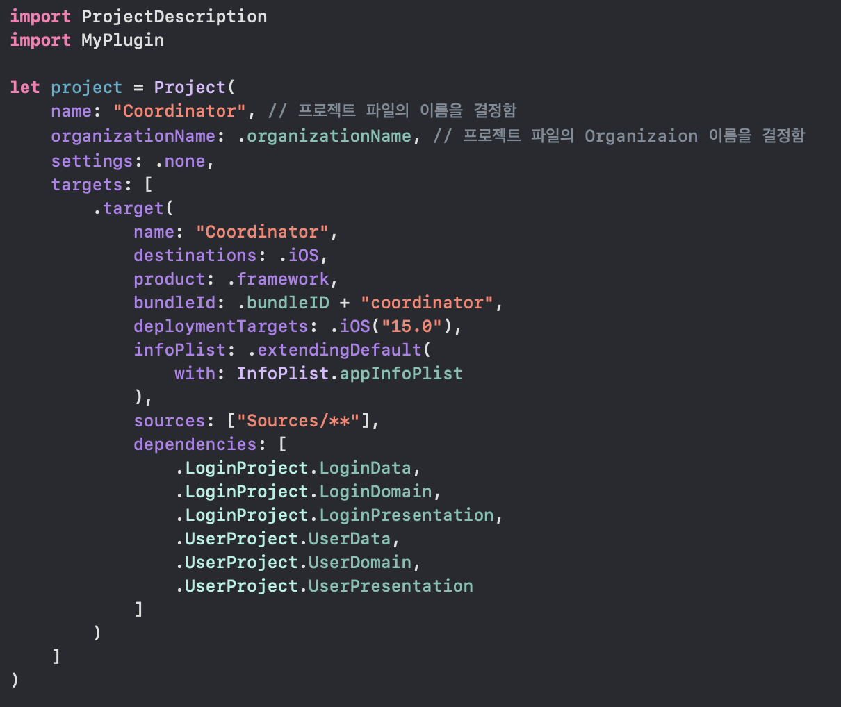 LoginPresentation/Project.swift, LoginData/Project.swift 그리고 이제 모든걸 알고 있는 coordinator를 작성하겠습니다.